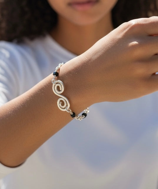 Elevate your everyday style with this stunning 925 sterling silver filled bracelet, featuring a hammered spiral design paired with a faceted black glass cube bead. The delicate figure-eight chain adds movement and sparkle, creating a sophisticated yet feminine piece that catches the light beautifully. Perfect for layering or wearing solo, this gorgeous bracelet combines artisanal craftsmanship with timeless elegance for a look that transitions effortlessly from day to night.