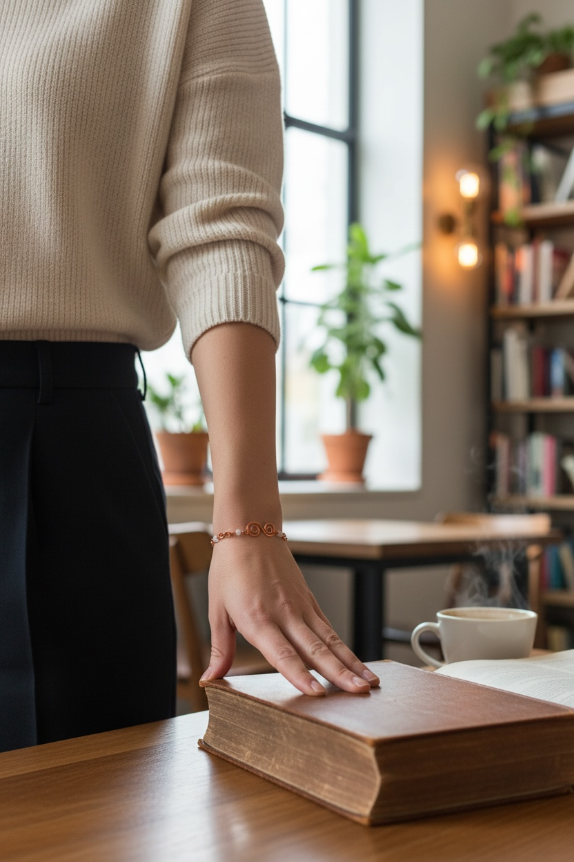 Elevate your everyday style with this 100% handmade copper bracelet. Meticulously crafted with a striking hammered spiral motif and complemented by shimmering glass beads, this piece radiates understated elegance. The polished copper catches the light beautifully, while the thoughtful beading adds feminine sophistication. Versatile enough for daily wear yet refined enough for special moments, this artisan-made bracelet becomes a cherished staple in any jewelry collection.